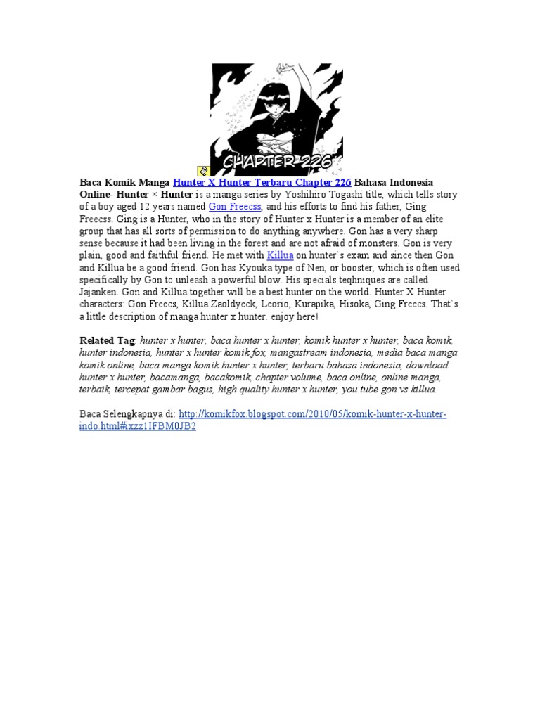 Sick tamburo torino. Di mangaku anda bisa baca komik online baca hunter x hunter chapter 330 bahasa indonesia mangaku secara gratis. Selamat membaca manga hunter x hunter chapter 147 bahasa indonesia jangan lupa mengklik tombol like dan share ya. Manga hunter x hunter bahasa indonesia pdf april 1 2018 nao kun manga ongoing meganebuknet komik manga hunterxhunter berceritakan tentang seorang anak berumur 12 tahun bernama gon freecss yang berpetualang untuk menemukan ayahnya yang hilang bernama ging freecss.